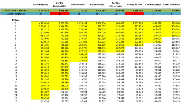 Una vez definido el umbral, queda claro entonces que sólo nueve (9) partidos o movimientos accedieron a la cifra repartidora. Como vimos en el texto anterior, esa cifra repartidora se aplica utilizando el método D’Hondt. Se toman los votos totales de cada uno de esos 9 movimientos, y se dividen por 1, 2, 3 y así sucesivamente. El resultado de esas divisiones se organiza de mayor a menor hasta llegar a la cifra a repartir, que son 100 curules. En la matriz abajo, en amarillo, vemos el resultado del método D’Hondt, donde se asignan las 100 curules.