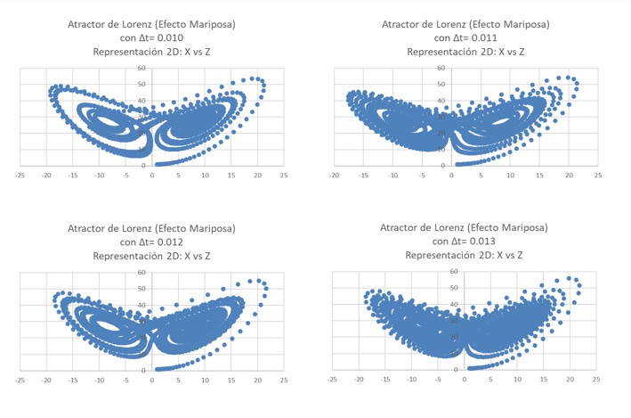 Con esas dos consideraciones, y partiendo de los datos del modelo original de Lorenz (β= 8/3, σ= 10, ρ= 28), construimos una hoja de Excel para resolver x, y, z. Asumo un ∆t = 0.01. Y graficamos en forma de dispersión hasta 2000 datos (filas) para tener datos suficientes para ver bien las alas. Esta simulación la hacemos cuatro veces, con ∆t = 0.010, en el segundo ∆t = 0.011, en el tercero con ∆t = 0.012 y en el cuarto con ∆t = 0.013. Nótese que con un pequeñísimo cambio en ∆t (cambio de 0.1% en cada simulación), cada mariposa es diferente, pero con patrones similares. Cada una es una sombra bidimensional del sistema completo.