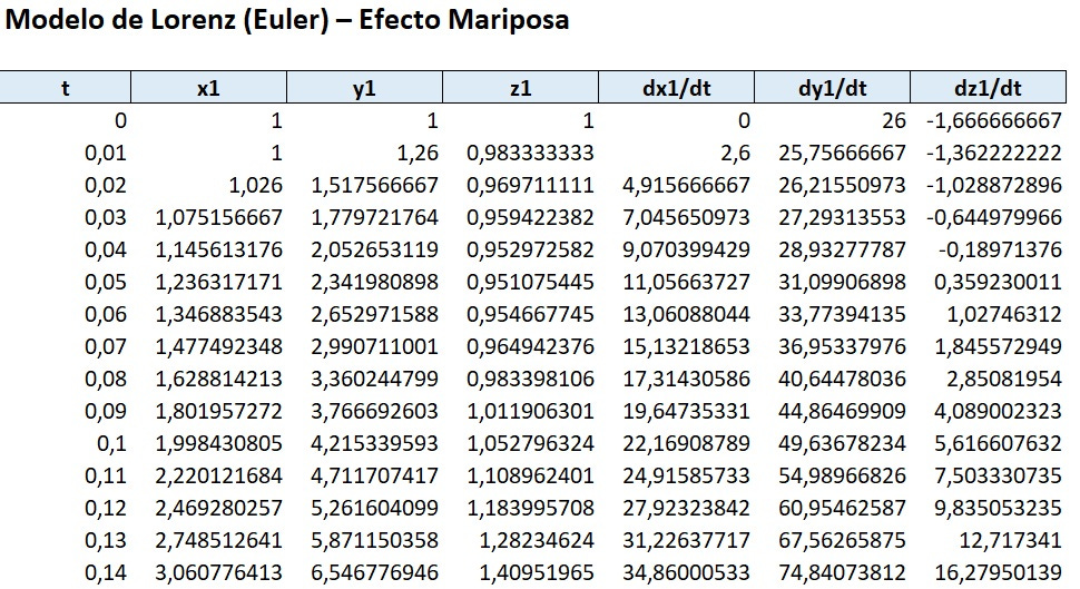 Excel no tiene un integrador numérico como Python o MATLAB, por lo que Excel no es capaz de resolver esas derivadas. Pero Excel sí puede hacer sumas y multiplicaciones repetitivas en filas y columnas. Entonces usamos el método de Euler como la forma más sencilla de aproximar la solución. El método de Euler no integra exactamente, sino que aproxima la integración mediante pasos discretos y pequeños. Se basa en la idea de que un pequeño cambio en el tiempo ∆t = 0.01 produce un cambio aproximado en la variable. (Euler: Xt+1 = Xt + (dx/dt) ∆t, y así igual para Y y Z)