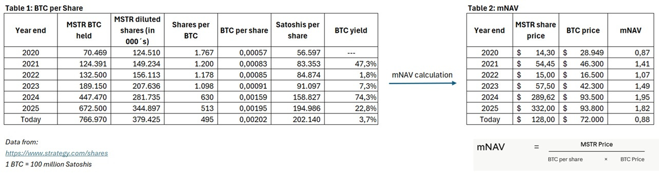 Independiente del mecanismo y sus diferencias que ya vimos, lo importante es lo que esa dilución genera. Lo cual es valor puro, eso sí, cuando las condiciones son las correctas. La crítica obvia y repetida es: “estás diluyendo a los accionistas existentes.” Sin embargo, esa visión tradicional olvida lo central detrás de la estrategia de Saylor que es darle más exposición a BTC a cada accionista. Se emiten más acciones, sí, pero cada acción termina respaldada por más BTC que antes. Es dilución en número, pero concentración en el activo que importa. Veamos porqué.