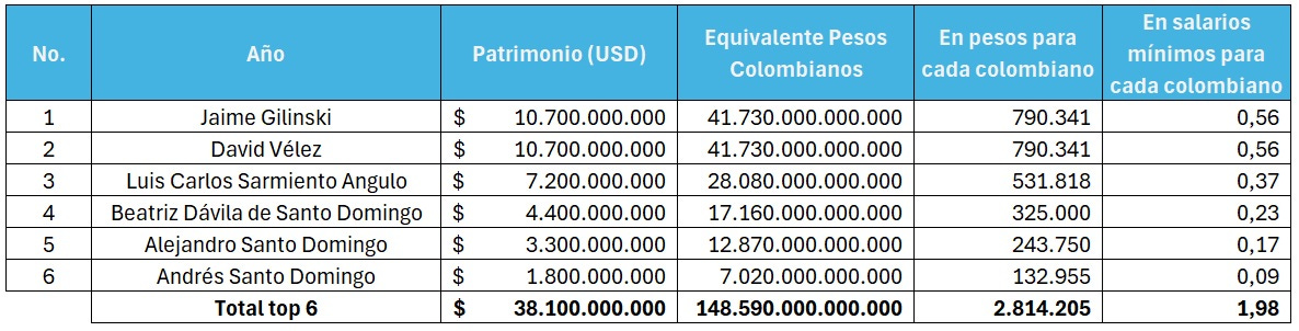 Según Forbes, los 6 más ricos de Colombia tienen un patrimonio de 38 billones de dólares (billones de los americanos). Con un dólar a 3.900 pesos, y repartiendo a los 52.8 millones de colombianos, cada ciudadano recibiría por una única vez menos de dos salarios mínimos (ver tabla abajo). Es decir, muchas décadas de flujos creados por empresas como Bavaria, Avianca, Caracol, Nubank, Grupo Aval, Corficolombiana, Nutresa, Yupi y Rimax dejan un stock que sólo da para un pago único de 2 salarios mínimos a cada colombiano. A mi este dato me deja particularmente atónito, porque muestra lo difícil que es crear y sobre todo acumular riqueza.