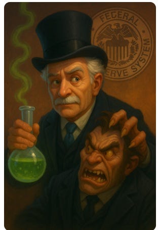 Cada acto de esta obra muestra la misma dinámica. Lo que empezó como un experimento respetable terminó entregándole más poder al monstruo. La Fed es el Dr. Jekyll de la estabilidad, hasta que las circunstancias liberan a su Hyde, que siempre termina ganando.