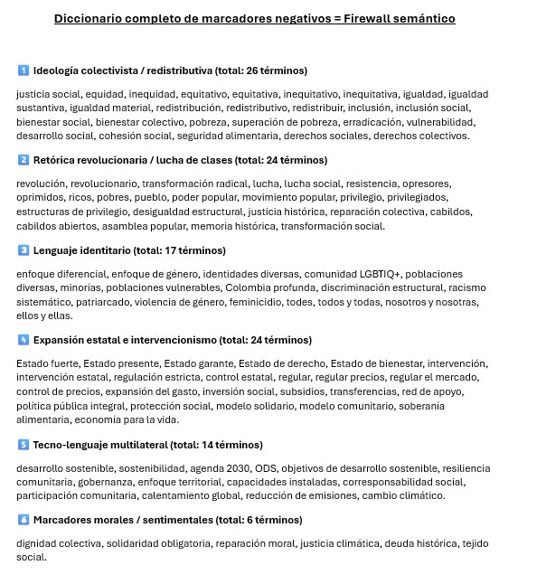 Este análisis no evalúa la calidad moral, humana o profesional de los candidatos, ni pretende determinar sus intenciones políticas. El ejercicio se limita exclusivamente a medir la frecuencia de ciertos términos en textos publicados por ellos, según un diccionario previamente definido. La presencia o ausencia de estos términos no implica necesariamente adhesión ideológica, sino que refleja patrones lingüísticos presentes en los documentos analizados. Los resultados no deben interpretarse como juicios personales sobre los candidatos, sino como un análisis descriptivo de su lenguaje político en el marco de la batalla cultural. Cualquier error en las transcripciones o en la interpretación del contenido corresponde enteramente al autor. Es un ejercicio teórico e ilustrativo; los resultados pueden variar si los textos analizados son diferentes y/o si se amplía o reduce el diccionario de términos utilizado para la comparación. Este análisis expresa únicamente una opinión. No representa la postura de ningún partido político, movimiento, institución o tercero. El autor no tiene vínculos laborales, contractuales o financieros con campañas, candidatos, partidos, empresas encuestadoras ni organizaciones relacionadas con el proceso electoral. No se busca beneficiar ni perjudicar a ningún aspirante; el propósito es estrictamente académico y analítico. La publicación de este contenido se ampara en el derecho fundamental a la libertad de expresión y opinión, consagrado en la Constitución Colombiana y en los tratados internacionales de derechos humanos. El análisis de discursos públicos es una práctica legítima en una sociedad democrática, y forma parte de la deliberación libre y plural que sustenta el debate ciudadano.