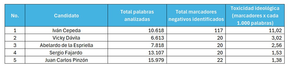 Antes de correr el diccionario por cada uno de los textos de los candidatos, la intuición personal me decía que Cepeda debía marcar altísimo en toxicidad ideológica. El resultado ratificó de lejos esa intuición. Sin embargo, la intuición me decía que Abelardo iba a ser el de menos toxicidad, pero el análisis técnico arrojó algo ligeramente diferente.