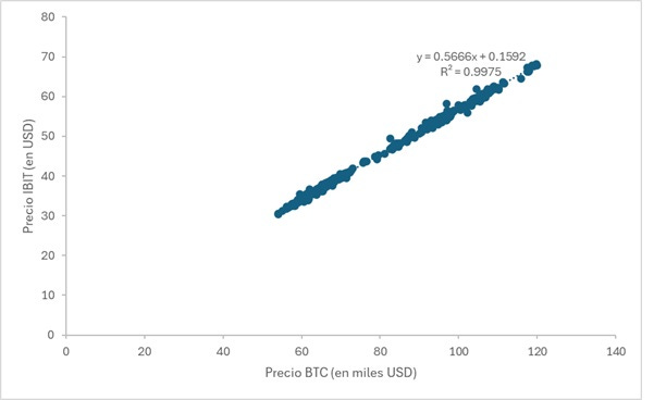 Precio IBIT = (0.5666 x Precio BTC en miles) + 0.1592