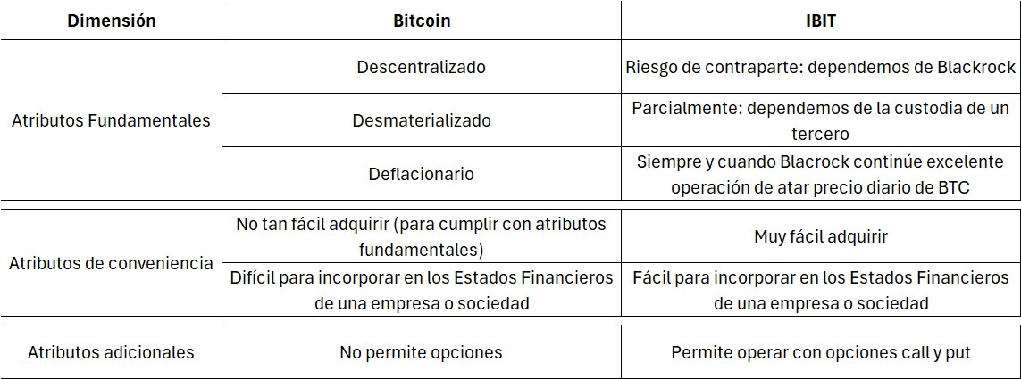 Lo ideal es poder tener custodia propia y descentralizada del Bitcoin, pues en la descentralización es donde reside el valor superior y fundamental del Bitcoin. Sin embargo, y en especial para las empresas, las normas legales generan mucha ambivalencia. El marco legal en Colombia no es del todo claro ni robusto para criptoactivos, las entidades reguladoras (Superfinanciera, DIAN, Banco de la República) han emitido múltiples comunicados restrictivos o cautelosos, lo que genera incertidumbre. Adicionalmente, el tratamiento contable generaría mucha discusión pues al Bitcoin habría que darle tratamiento de bien intangible no monetario de vida indefinida, y no se considera moneda ni equivalente de efectivo. Ello implica que por técnica contable el valor del BTC habría que actualizarlo periódicamente por Valor Razonable, algo que es difícil para un activo que tranza 24/7 y con alta volatilidad, no hay cuentas específicas en los PUC tradicionales, requiere criterios de deterioro y revelaciones y soportes técnicos (hash, wallets). Lo anterior siempre con el riesgo adicional de una disputa y discusión de criterio con la entidad tributaria. Por ello, las empresas y sus auditores simplemente evitan tener Bitcoin en sus activos. Es en estos casos es donde el IBIT subsana el riesgo y permite gozar de los elementos positivos que da la exposición al BTC.