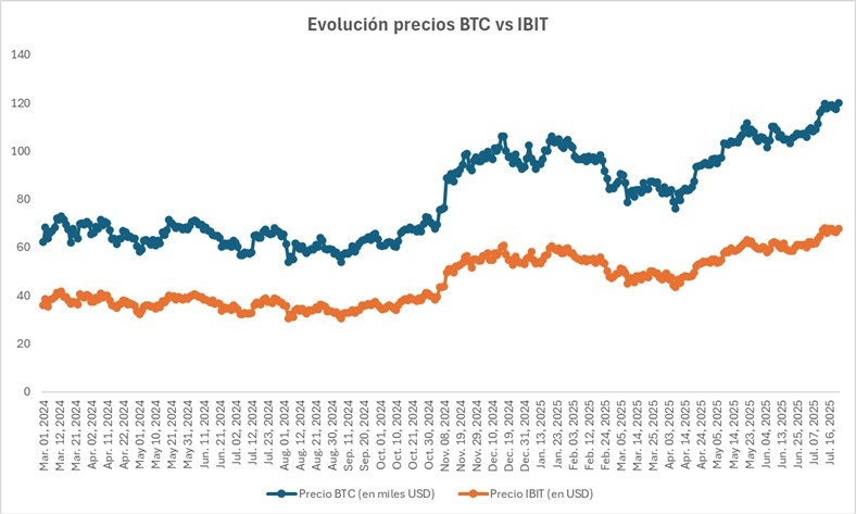 Cada acción de IBIT representa una fracción de un Bitcoin, BlackRock compra Bitcoin real y lo guarda en una bóveda (Coinbase). Ese BTC se divide entre todas las acciones emitidas del fondo y el precio de IBIT refleja el valor del BTC subyacente a las 4:00 p.m. (Eastern time). IBIT cotiza en el Nasdaq, igual que cualquier acción o ETF. Con ello, el IBIT da exposición muy fidedigna de lo que ocurre con el precio de Bitcoin. Desde su inicio, esa fracción se ha mantenido en 1/1800, con lo que podemos decir que 1 BTC es aproximadamente 1800 unidades de IBIT, y por lo tanto sus precios siguen esa misma relación.