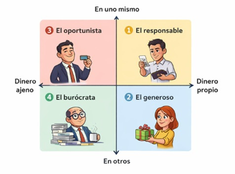 Descripción: En el cuadrante abajo y a la derecha, que yo llamo Cuadrante 2 está El Generoso. Es la persona que decide usar su propio dinero en beneficio de otros. Ayuda, dona, regala, invierte en familia o comunidad. Psicológicamente entiende que la cooperación es valiosa, pero que la virtud sólo existe si es voluntaria. No obliga, no impone y no moraliza desde la coerción. Sabe que puede equivocarse al evaluar qué necesita el otro, pero acepta ese riesgo porque el costo sigue siendo suyo.